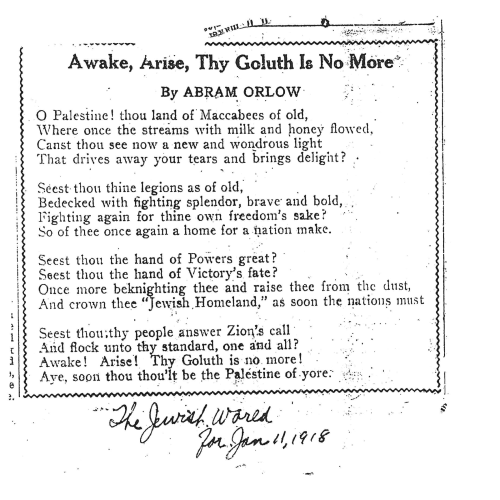 Like my grandfather, Abram Orlow, I am a Zionist. To me the modern State of Israel is central to my Jewish and human identity. As hard as it is to imagine what the world looked like a 100 years ago, it is harder for me to imagine a world before Israel existed. Reading this poem I am filled with wonder. What do we make of the romantic call for a reprisal of the Hasmomean military victory from the pen of an 18-year-old? How did he balance his fierce nationalism with a universal appeal to flock to this yet to be realized Zionist “standard”. He is simultaneously asking Palestine to be born so we can be like ever other nations and also be exceptional and a model to the nations. I have no idea if my grandfather ever stepped foot in the land of Israel. What was Palestine to an immigrant from the Ukraine who would go on to spend his career as an immigration lawyer in “Goluth“?